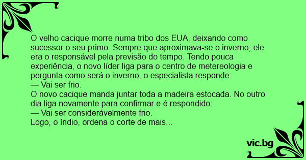 O velho cacique morre numa tribo dos EUA, deixando como sucessor o seu primo. Sempre que aproximava-se o inverno, ele era o responsável pela previsão do tempo. Tendo pouca experiência, o novo líder liga para o centro de metereologia e pergunta como será o inverno, o especialista responde: