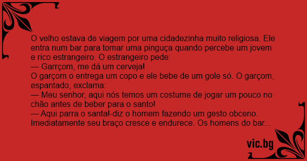 O velho estava de viagem por uma cidadezinha muito religiosa. Ele entra num bar para tomar uma pinguça quando percebe um jovem e rico estrangeiro. O estrangeiro pede: