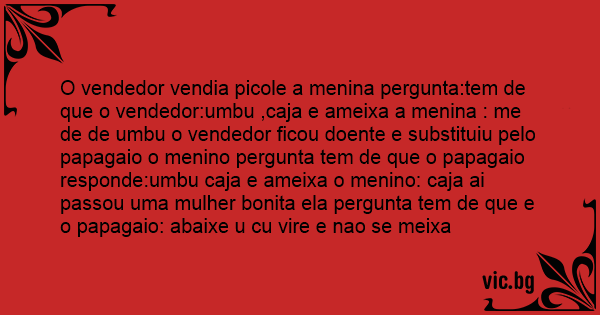 O vendedor vendia picole a menina pergunta:tem de que o vendedor:umbu ,caja e ameixa a menina : me de de umbu o vendedor ficou doente e substituiu pelo papagaio o menino pergunta tem de que o papagaio responde:umbu caja e ameixa o menino: caja ai passou uma mulher bonita ela pergunta tem de que e o papagaio: abaixe u cu vire e nao se meixa