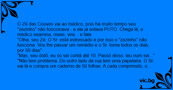 O Zé das Couves vai ao médico, pois há muito tempo seu "zezinho" não funcionava - e ele já estava РUТО. Chega lá, o médico examina, mexe, vira... e fala: