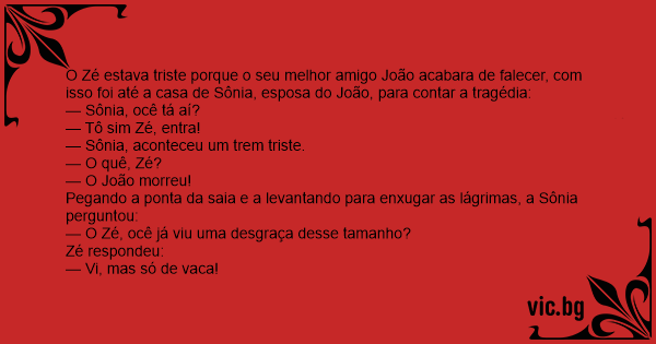 O Zé estava triste porque o seu melhor amigo João acabara de falecer, com isso foi até a casa de Sônia, esposa do João, para contar a tragédia: