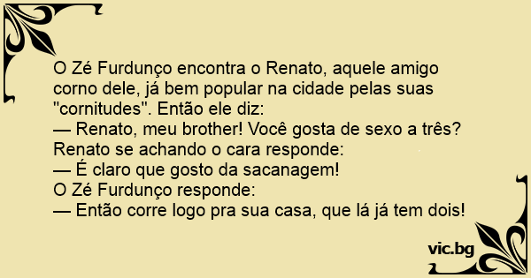 O Zé Furdunço encontra o Renato, aquele amigo соrnо dele, já bem popular na cidade pelas suas "cornitudes". Então ele diz: