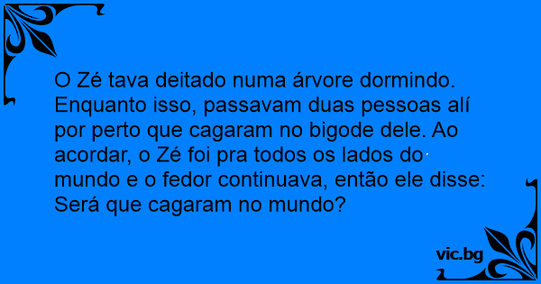 O Zé tava deitado numa árvore dormindo. Enquanto isso, passavam duas pessoas alí por perto que cagaram no bigode dele. Ao acordar, o Zé foi pra todos os lados do mundo e o fedor continuava, então ele disse: Será que cagaram no mundo?