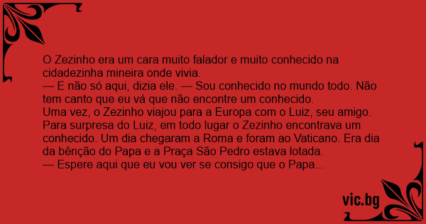 Uma vez, o Zezinho viajou para a Europa com o Luiz, seu amigo. Para surpresa do Luiz, em todo lugar o Zezinho encontrava um conhecido. Um dia chegaram a Roma e foram ao Vaticano. Era dia da bênção do Papa e a Praça São Pedro estava lotada.