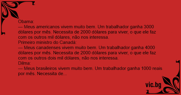 — Meus brasileiros vivem muito bem. Um trabalhador ganha 1000 reais por mês. Necessita de 2000 reais para viver, de onde ele consegue os outros mil reais, não nos interessa.