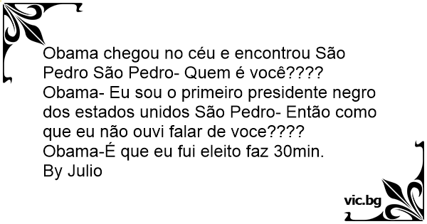 Obama- Eu sou o primeiro presidente nеgrо dos estados unidos São Pedro- Então como que eu não ouvi falar de voce????