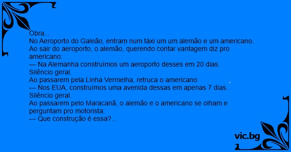 No Aeroporto do Galeão, entram num táxi um um alemão e um americano. Ao sair do aeroporto, o alemão, querendo contar vantagem diz pro americano:
