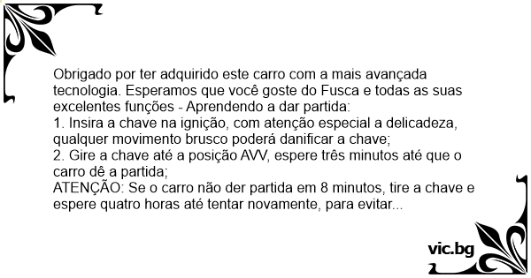 Obrigado por ter adquirido este carro com a mais avançada tecnologia. Esperamos que você goste do Fusca e todas as suas excelentes funções - Aprendendo a dar partida: