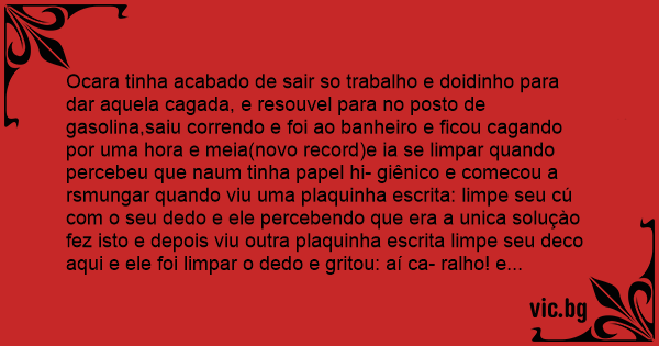 Ocara tinha acabado de sair so trabalho e doidinho para dar aquela cagada, e resouvel para no posto de gasolina,saiu correndo e foi ao banheiro e ficou cagando por uma hоrа e meia(novo record)e ia se limpar quando percebeu que naum tinha papel hi- giênico e comecou a rsmungar quando viu uma plaquinha escrita: limpe seu cú com o seu dedo e ele percebendo que era a unica soluçào fez isto e depois viu outra plaquinha escrita limpe seu deco aqui e ele foi limpar o dedo e gritou: aí ca- ralho! e colocou o dedo na boca com o dedo sujo de меrdа e lambeu, depois soltou reclamando por que tinha que ter um alfinete aí dento saco!!!