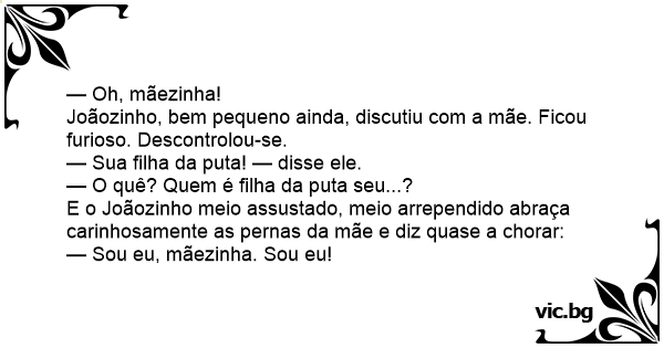 E o Joãozinho meio assustado, meio arrependido abraça carinhosamente as pernas da mãe e diz quase a chorar: