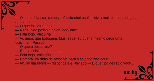 — Ah, só um rádio! — responde ele, aliviado — E que tipo de radio você quer, querida?