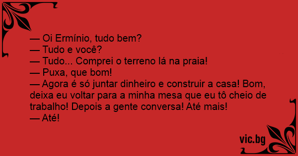 — Agora é só juntar dinheiro e construir a casa! Bom, deixa eu voltar para a minha mesa que eu tô cheio de trabalho! Depois a gente conversa! Até mais!