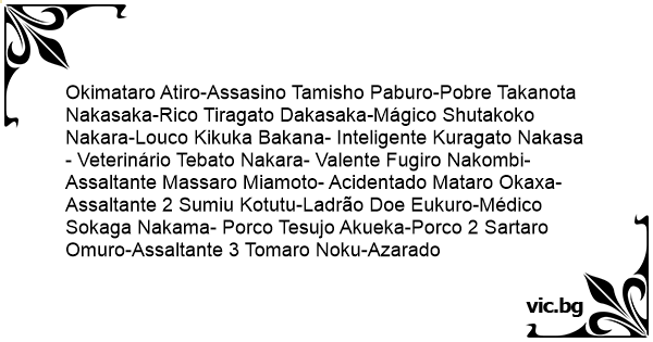 Okimataro Atiro-Assasino Tamisho Paburo-Pobre Takanota Nakasaka-Rico Tiragato Dakasaka-Mágico Shutakoko Nakara-Louco Kikuka Bakana- Inteligente Kuragato Nakasa- Veterinário Tebato Nakara- Valente Fugiro Nakombi- Assaltante Massaro Miamoto- Acidentado Mataro Okaxa-Assaltante 2 Sumiu Kotutu-Ladrão Doe Eukuro-Médico Sokaga Nakama- Роrсо Tesujo Akueka-Роrсо 2 Sartaro Omuro-Assaltante 3 Tomaro Noku-Azarado