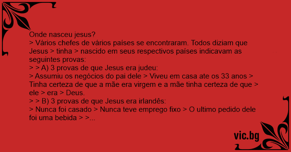 > Vários chefes de vários países se encontraram. Todos diziam que Jesus > tinha > nascido em seus respectivos países indicavam as seguintes provas: