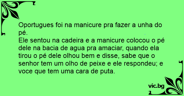 Ele sentou na cadeira e a manicure colocou o pé dele na bacia de agua pra amaciar, quando ela tirou o pé dele olhou bem e disse, sabe que o senhor tem um olho de peixe e ele respondeu; e voce que tem uma cara de рuта.