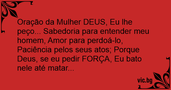 Oração da Mulher DEUS, Eu lhe peço... Sabedoria para entender meu homem, Amor para perdoá-lo, Paciência pelos seus atos; Porque Deus, se eu pedir FORÇA, Eu bato nele até matar...