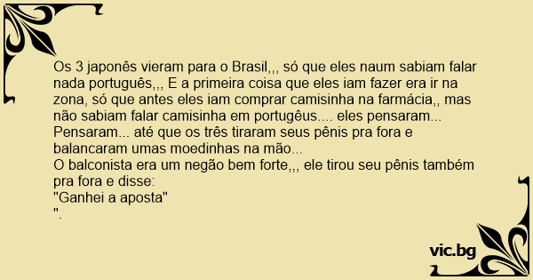 Os 3 japonês vieram para o Brasil,,, só que eles naum sabiam falar nada português,,, E a primeira coisa que eles iam fazer era ir na zona, só que antes eles iam comprar camisinha na farmácia,, mas não sabiam falar camisinha em portugêus.... eles pensaram... Pensaram... até que os três tiraram seus pênis pra fora e balancaram umas moedinhas na mão...