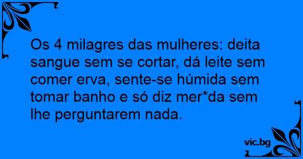 Os 4 milagres das mulheres: deita sangue sem se cortar, dá leite sem comer erva, sente-se húmida sem tomar banho e só diz mer*da sem lhe perguntarem nada.