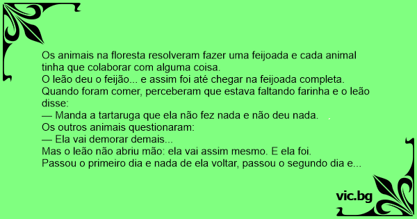 — Ah... Vamos comer! A tartaruga saiu de dentro do mato e falou: