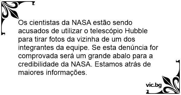 Os cientistas da NASA estão sendo acusados de utilizar o telescópio Hubble para tirar fotos da vizinha de um dos integrantes da equipe. Se esta denúncia for comprovada será um grande abalo para a credibilidade da NASA. Estamos atrás de maiores informações.