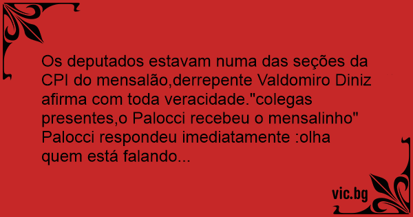 Os deputados estavam numa das seções da CPI do mensalão,derrepente Valdomiro Diniz afirma com toda veracidade."colegas presentes,o Palocci recebeu o mensalinho"