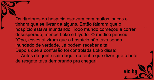 Os diretores do hospício estavam com muitos loucos e tinham que se livrar de alguns. Então falaram que o hospício estava inundando. Todo mundo começou a correr desesperado, menos Loko e Llyodo. O médico pensou "Opa, esses ai viram que o hospício não tava sendo inundado de verdade. Já podem receber alta!"