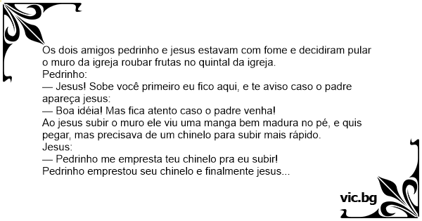 Os dois amigos pedrinho e jesus estavam com fome e decidiram pular o muro da igreja roubar frutas no quintal da igreja.
