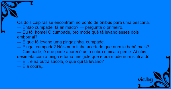 — Cumpade, é que pode aparecê uma cobra e рiса a gente. Aí nóis desinfeta com a pinga e toma uns gole que é pra mode num sinti a dô.