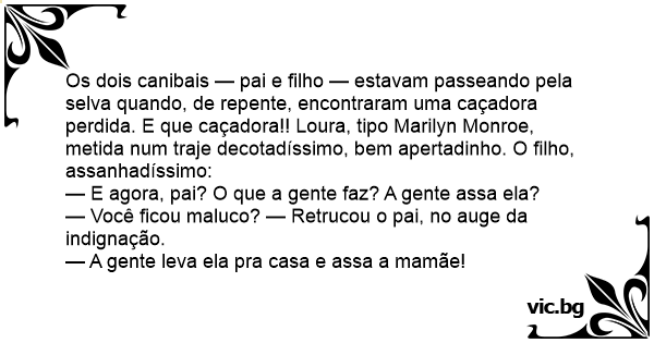 En kannibal skulle lære opp sønnen til å jakte, og de la seg i skjul ved en sti hvor det ofte kom folk. Etter en stund kom det en gammel, nokså feit dame, og sønnen var klar for å angripe: – Pappa,...