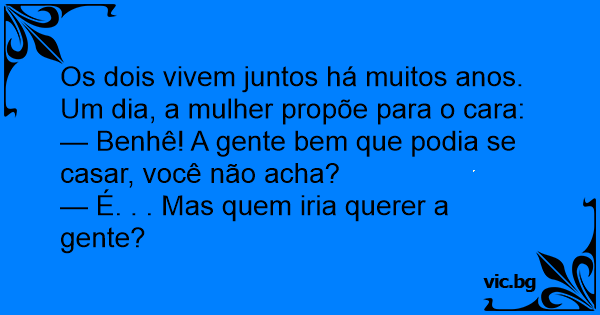 Os dois vivem juntos há muitos anos. Um dia, a mulher propõe para o cara: