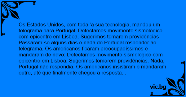 Os Estados Unidos, com toda ‘a sua tecnologia, mandou um telegrama para Portugal: Detectamos movimento sismológico com epicentro em Lisboa. Sugerimos tomarem providências Passaram-se alguns dias e nada de Portugal responder ao telegrama. Os americanos ficaram preocupadíssimos e mandaram de novo: Detectamos movimento sismológico com epicentro em Lisboa. Sugerimos tomarem providências. Nada, Portugal não respondia. Os americanos insistiram e mandaram outro, até que finalmente chegou a resposta dos portugueses: Detectamos o líder do Movimento Sismológico e o prendemos em Lisboa. Após muita tortura ele confessou tratar-se do tal de Epicentro. Só não prosseguimos com as investigações porque fomos atingidos por um pu*a terremoto!