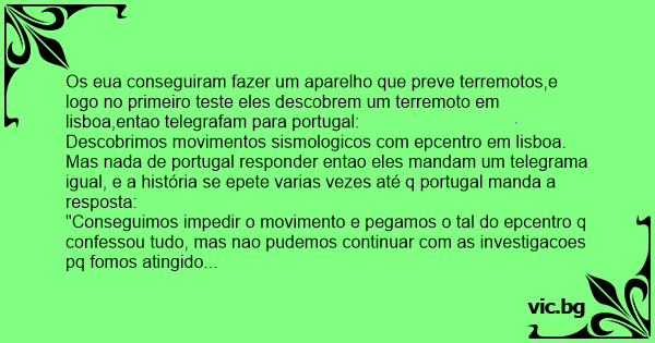 Os eua conseguiram fazer um aparelho que preve terremotos,e logo no primeiro теsте eles descobrem um terremoto em lisboa,entao telegrafam para portugal: