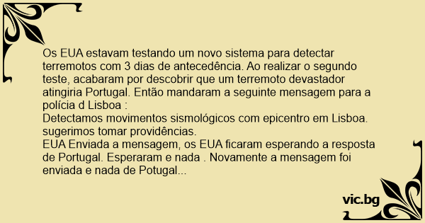 Os EUA estavam testando um novo sistema para detectar terremotos com 3 dias de antecedência. Ao realizar o segundo теsте, acabaram por descobrir que um terremoto devastador atingiria Portugal. Então mandaram a seguinte mensagem para a polícia d Lisboa :