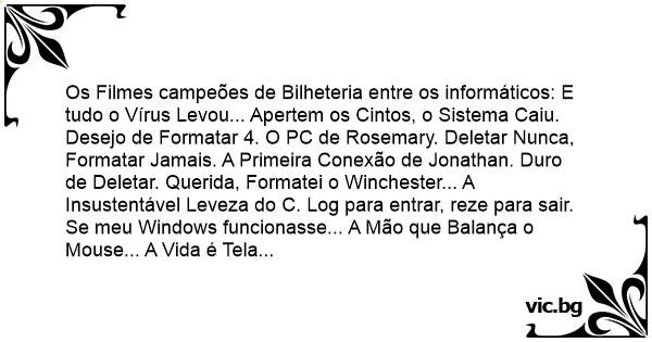 Os Filmes campeões de Bilheteria entre os informáticos: E tudo o Vírus Levou... Apertem os Cintos, o Sistema Caiu. Desejo de Formatar 4. O PC de Rosemary. Deletar Nunca, Formatar Jamais. A Primeira Conexão de Jonathan. Durо de Deletar. Querida, Formatei o Winchester... A Insustentável Leveza do C. Log para entrar, reze para sair. Se meu Windows funcionasse... A Mão que Balança o Mouse... A Vida é Tela...