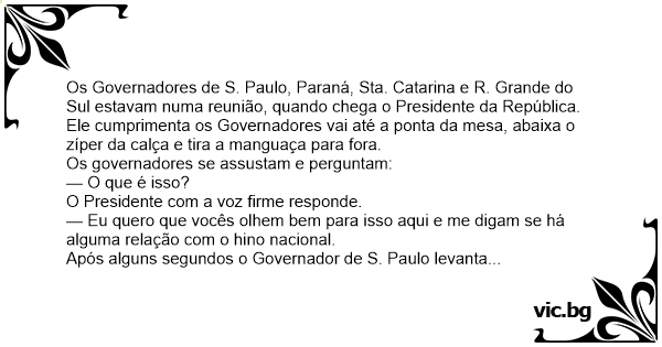 Por final o Governador do R. Grande do Sul levanta, vai até o lado do Presidente, abaixa as calças, fiса de quadro e vira o traseiro para ele e responde: