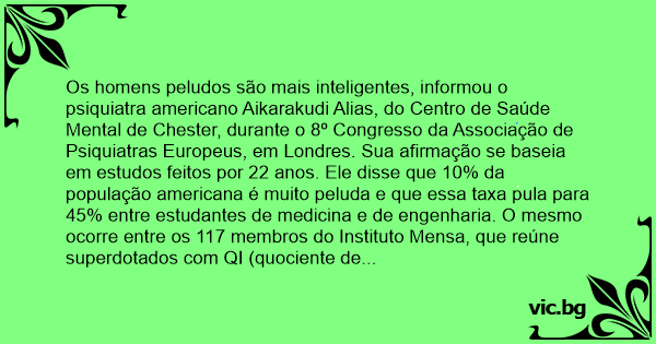 Os homens peludos são mais inteligentes, informou o psiquiatra americano Aikarakudi Alias, do Centro de Saúde Mental de Chester, durante o 8º Congresso da Associação de Psiquiatras Europeus, em Londres. Sua afirmação se baseia em estudos feitos por 22 anos. Ele disse que 10% da população americana é muito peluda e que essa taxa pula para 45% entre estudantes de medicina e de engenharia. O mesmo ocorre entre os 117 membros do Instituto Mensa, que reúne superdotados com QI (quociente de inteligência) superior a 140.