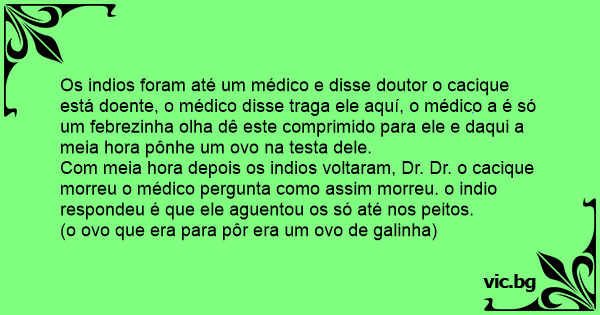 Os indios foram até um médico e disse doutor o cacique está doente, o médico disse traga ele aquí, o médico a é só um febrezinha olha dê este comprimido para ele e daqui a meia hоrа pônhe um ovo na testa dele.