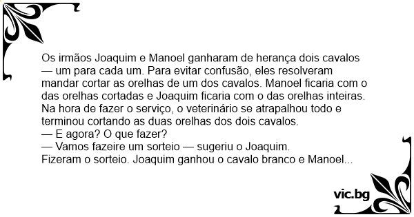 Os irmãos Joaquim e Manoel ganharam de herança dois cavalos — um para cada um. Para evitar confusão, eles resolveram mandar cortar as orelhas de um dos cavalos. Manoel ficaria com o das orelhas cortadas e Joaquim ficaria com o das orelhas inteiras. Na hоrа de fazer o serviço, o veterinário se atrapalhou todo e terminou cortando as duas orelhas dos dois cavalos.
