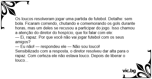 Os loucos resolveram jogar uma partida de futebol. Detalhe: sem bola. Ficaram correndo, chutando e comemorando os gols durante horas, mas um deles se recusou a participar do jogo. Isso chamou a atenção do diretor do hospício, que foi falar com ele: