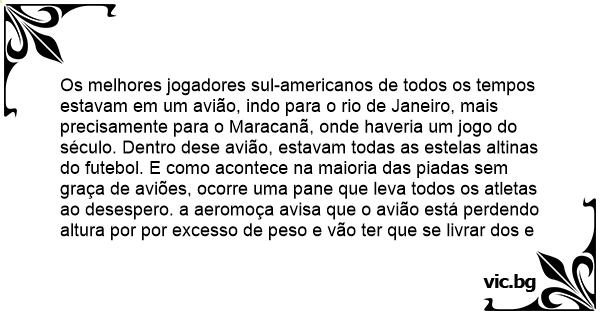 Os melhores jogadores sul-americanos de todos os tempos estavam em um avião, indo para o rio de Janeiro, mais precisamente para o Maracanã, onde haveria um jogo do século. Dentro dese avião, estavam todas as estelas altinas do futebol. E como acontece na maioria das piadas sem graça de aviões, ocorre uma pane que leva todos os atletas ao desespero. a aeromoça avisa que o avião está perdendo altura por por excesso de peso e vão ter que se livrar dos e