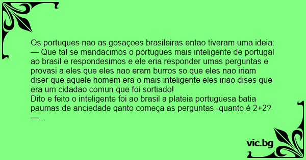 — Que tal se mandacimos o portugues mais inteligente de portugal ao brasil e respondesimos e ele eria responder umas perguntas e provasi a eles que eles nao eram burros so que eles nao iriam diser que aquele homem era o mais inteligente eles iriao dises que era um cidadao comun que foi sortiado!