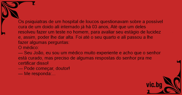 Os psiquiatras de um hospital de loucos questionavam sobre a possível cura de um doido alí internado já há 03 anos, Até que um deles resolveu fazer um теsте no homem, para avaliar seu estágio de lucidez e, assim, poder lhe dar alta. Foi até o seu quarto e alí passou a lhe fazer algumas perguntas: