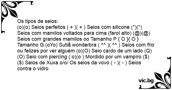 (o)(o) Seios perfeitos ( + )( + ) Seios com silicone (*)(*) Seios com mamilos voltados para cima (farol alto) (@)(@) Seios com grandes mamilos oo Tamanho P { O }{ O } Tamanho G (oYo) Sutiã wonderbra ( ^^ )( ^^ ) Seios com frio ou felizes por ver alguém (o)(O) Seio caído de um lado (Q)(O) Seio com piercing (:o)(o ) Mordido por um vampiro ($)($) Seios de Xuxa o/o/ Os seios da vovó ( - )( - ) Seios contra o vidro