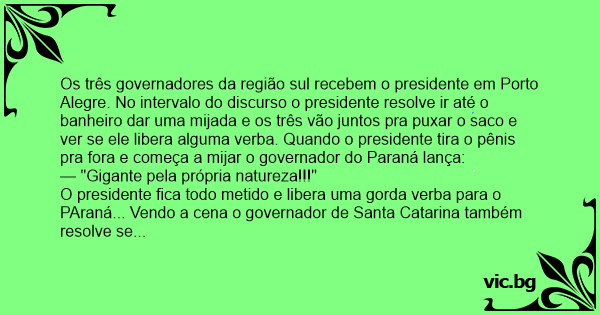 Os três governadores da região sul recebem o presidente em Porto Alegre. No intervalo do discurso o presidente resolve ir até o banheiro dar uma mijada e os três vão juntos pra puxar o saco e ver se ele libera alguma verba. Quando o presidente tira o pênis pra fora e começa a mijar o governador do Paraná lança: