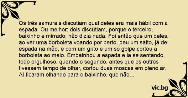 Os três samurais discutiam qual deles era mais hábil com a espada. Ou melhor: dois discutiam, porque o terceiro, baixinho e mirrado, não dizia nada. Foi então que um deles, ao ver uma borboleta voando por perto, deu um salto, já de espada na mão, e com um grito e um só golpe cortou a borboleta ao meio. Embainhou a espada e ia se sentando, todo orgulhoso, quando o segundo, antes que os outros tivessem tempo de olhar, cortou duas moscas em pleno ar. Aí ficaram olhando para o baixinho, que não dizia nada. Então apareceu um pernilongo voando. O baixinho deu um salto e zapt! Com a espada. O pernilongo continuou voando. Os outros dois samurais começaram a olhar para ele. E ele nada. Aí um deles não agüentou e disse: