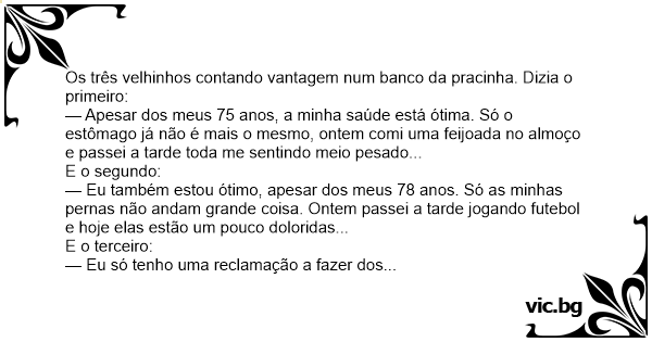 Os três velhinhos contando vantagem num banco da pracinha. Dizia o primeiro: