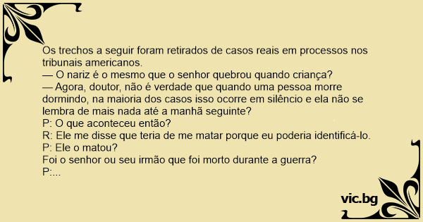— Agora, doutor, não é verdade que quando uma pessoa morre dormindo, na maioria dos casos isso ocorre em silêncio e ela não se lembra de mais nada até a manhã seguinte?