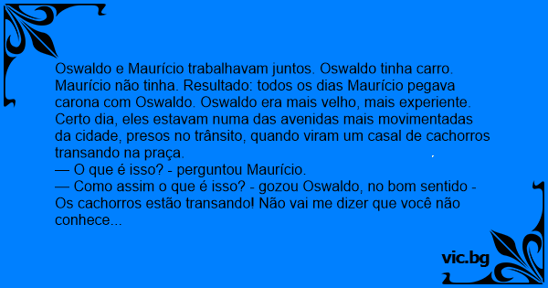 Oswaldo e Maurício trabalhavam juntos. Oswaldo tinha carro. Maurício não tinha. Resultado: todos os dias Maurício pegava carona com Oswaldo. Oswaldo era mais velho, mais experiente. Certo dia, eles estavam numa das avenidas mais movimentadas da cidade, presos no trânsito, quando viram um casal de cachorros transando na praça.