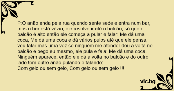 P:O anão anda pela rua quando sente sede e entra num bar, mas o bar está vázio, ele resolve ir até o balcão, só que o balcão é alto então ele começa a pular e falar: Me dá uma coca, Me dá uma coca e dá vários pulos até que ele pensa, vou falar mas uma vez se ninguém me atender dou a volta no balcão e pego eu mesmo, ele pula e fala: Me dá uma coca.