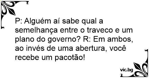 P: Alguém aí sabe qual a semelhança entre o traveco e um plano do governo? R: Em ambos, ao invés de uma abertura, você recebe um pacotão!